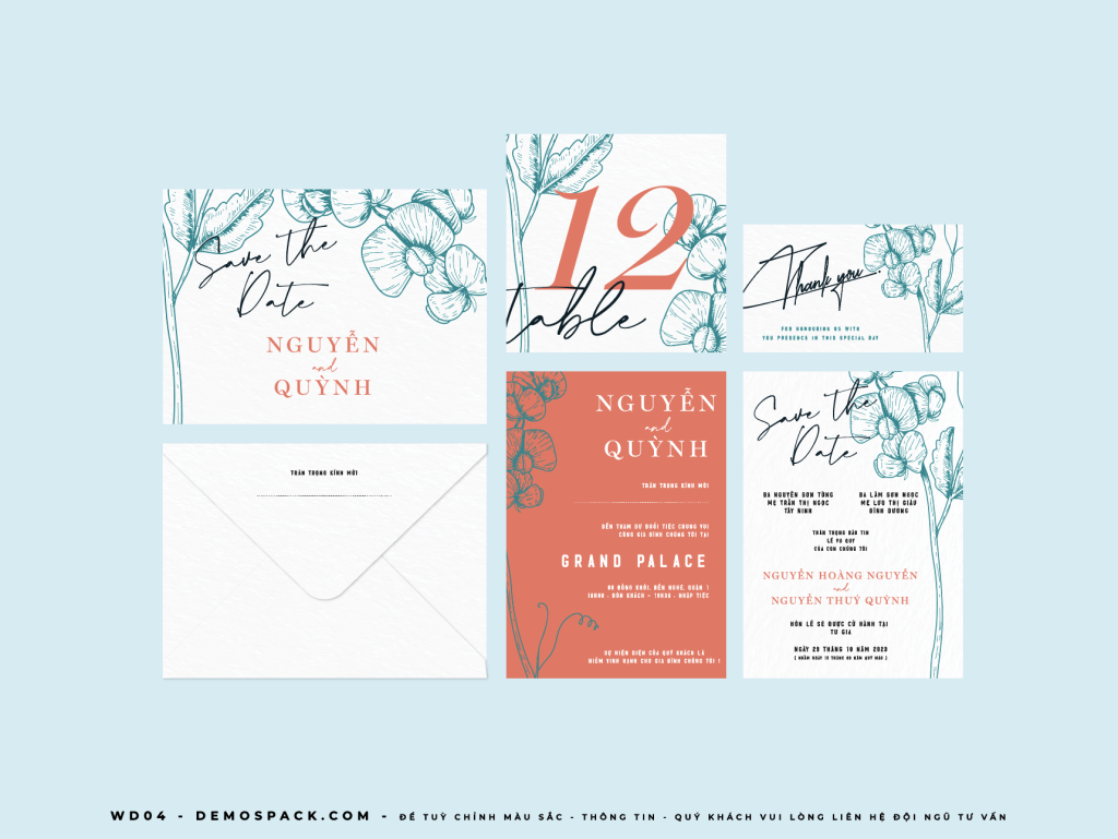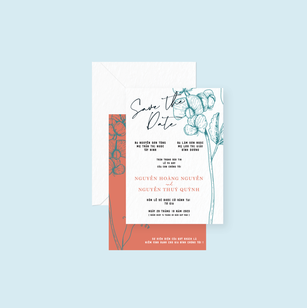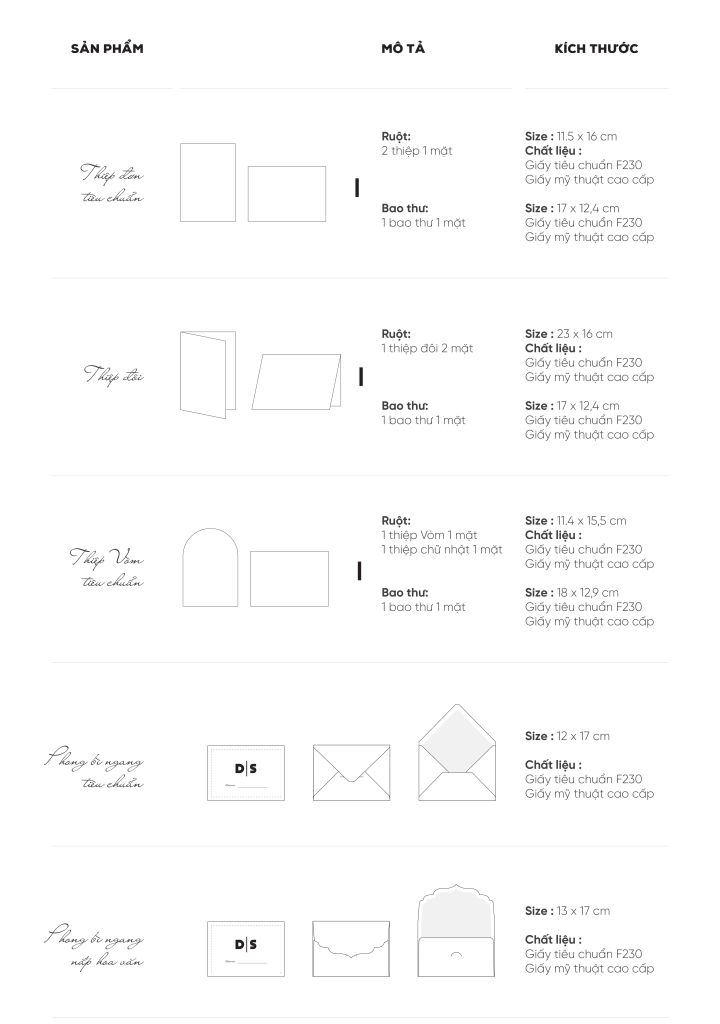 Qui cách: Ruột thiệp: Gồm 2 thiệp đơn in 1 mặt. Bao thiệp: Gồm 1 bao thư in 1 mặt. Chất liệu: Giấy F180 – F230 hoặc Giấy mỹ thuật cao cấp